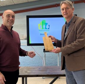 Foto: Djorn Noordman (links, lid kernteam NPB) overhandigt het NPB-plankje aan Ralph Mens (rechts, hoofdredacteur bij Stichting Hortipoint).