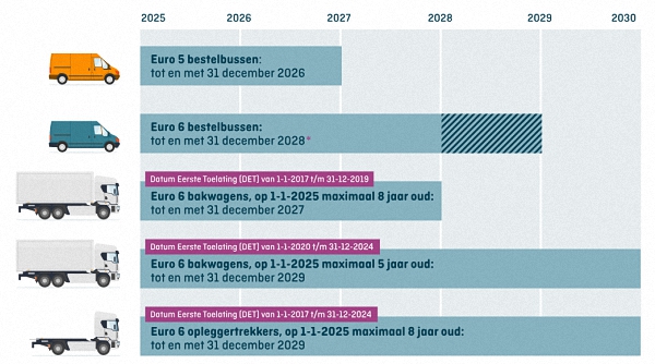 Goed om te weten is dat voor Euro 6 bestelbussen een wetswijziging in de maak is (update 25 april 2025). Bedrijfswagens met emissieklasse 6 mogen nu tot en met 31 december 2027 de zero-emissiezones binnen. De intentie is om dit met een jaar te verlengen, dus tot en met 31 december 2028*.